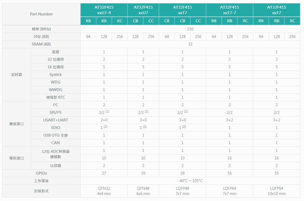 ARM Cortex®-M4 AT32F415 系列 产品列表