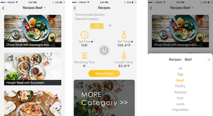 这是利用Wifi传输技术与APP(Cook Plus)配对使用的低温慢煮机方案。设备与APP连接后,在APP主界面可遥控设备。具有启动/关闭设备、设置目标温度和定时时间、显示设备检测到的温度、切换温度单位、根据已有的食谱一键设定温度和烹饪时间及计时提醒等功能。